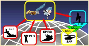 PLB - персональный радиобуй; EPIRB - аварийный радиобуй; LUT - станция приема и обработки информации; MCC - центр управления системой; RCC- спасательно-координационный центр;
